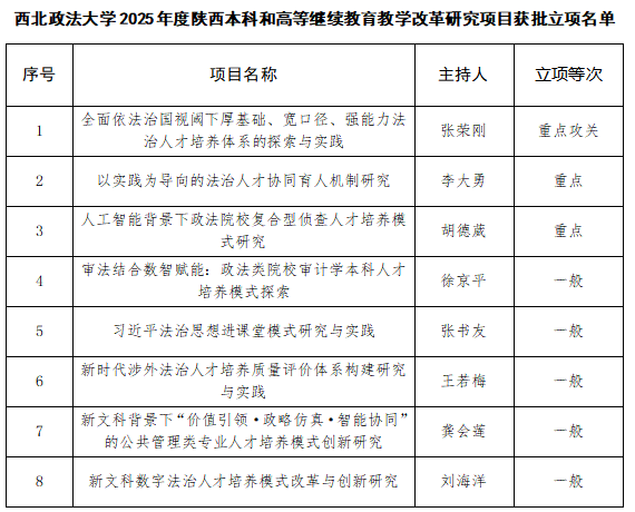 近日,陕西省教育厅公布了2025年度陕西本科和高等继续教育教学改革研究项目立项结果,我校8个项目入选,其中重点攻关项目1项,重点项目2项,一般项目5项。 陕西高等教育教学改革研究项目由陕西省教育厅统筹组织、审核立项,是省内深化高等教育教学改革的重要抓手。项目聚焦教学实践重点难点,以提升育人质量为核心目标,实行每两年评选一次的立项机制,为全省高校教育教学创新发展提供有力支撑。 学校高度重视教学改革研究工作,始终将教改项目作为推动教学质量提升、培育教学成果的重要载体。此次项目获批,既是省教育厅对我校教学改革工作的充分肯定,也是我校深化教育教学改革、强化内涵建设的重要成果。下一步,学校将以此次立项为契机,进一步强化教改项目全过程管理,严格落实项目研究任务,加强对项目实施的指导与保障,全力推动项目研究与教学实践深度融合,加速教改成果的转化与推广,以高质量教学改革赋能人才培养质量全面提升,为学校内涵式发展注入更强动力。 (供稿:教务处 撰稿:潘龙 审核:董玮)
