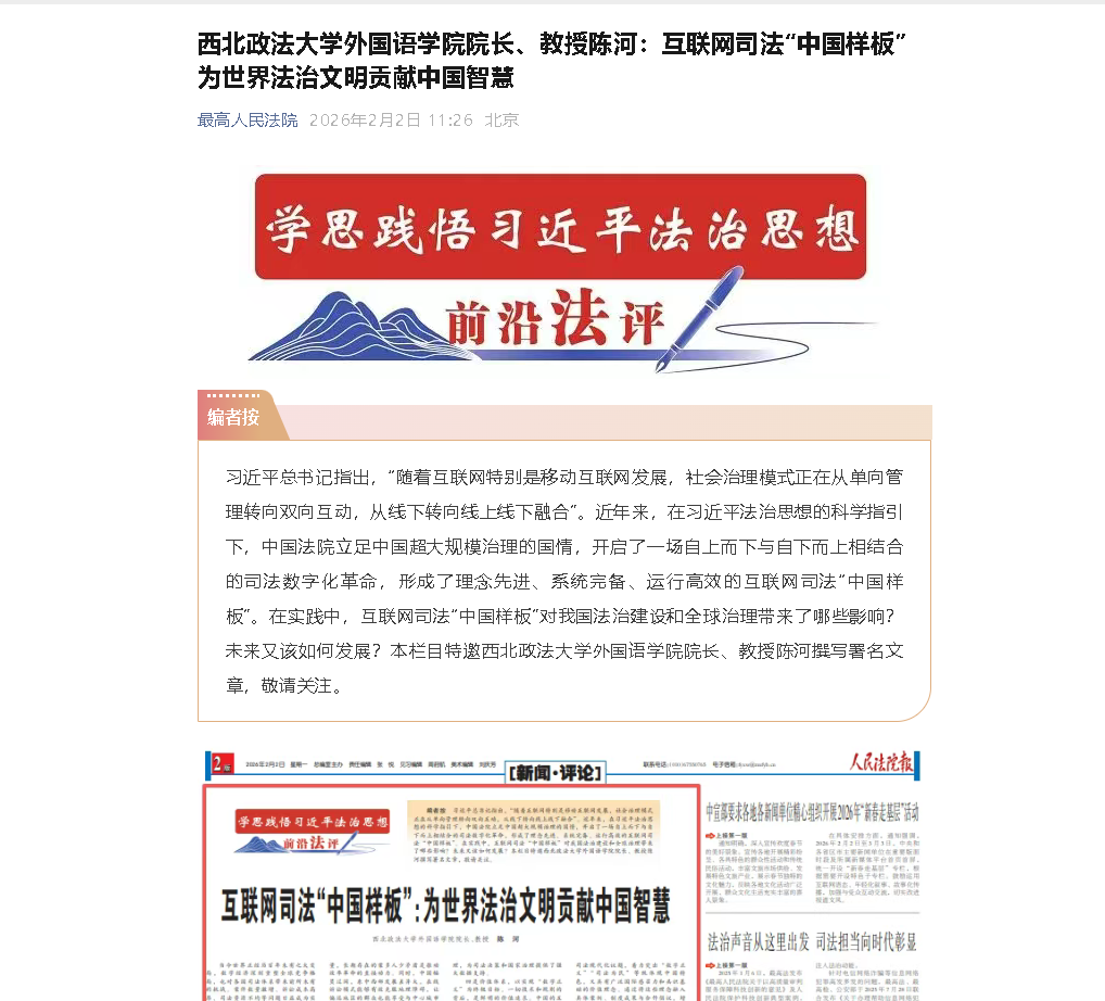 【最高人民法院】西北政法大学外国语学院院长、教授陈河:互联网司法“中国样板” 为世界法治文明贡献中国智慧: