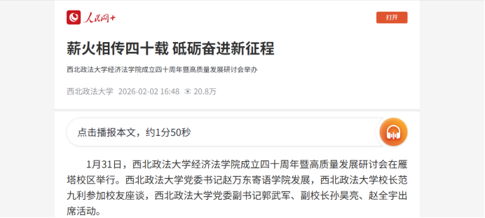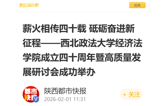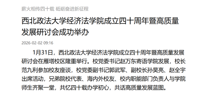 1月31日,西北政法大学经济法学院成立四十周年暨高质量发展研讨会在雁塔校区隆重举行。校党委书记赵万东寄语学院发展,校长范九利参加校友座谈,校党委副书记郭武军、副校长孙昊亮、赵全宇出席活动,兄弟院校代表、海内外校友、校内职能部门负责人与学院师生齐聚一堂,共忆四十载办学初心,共话高质量发展蓝图。