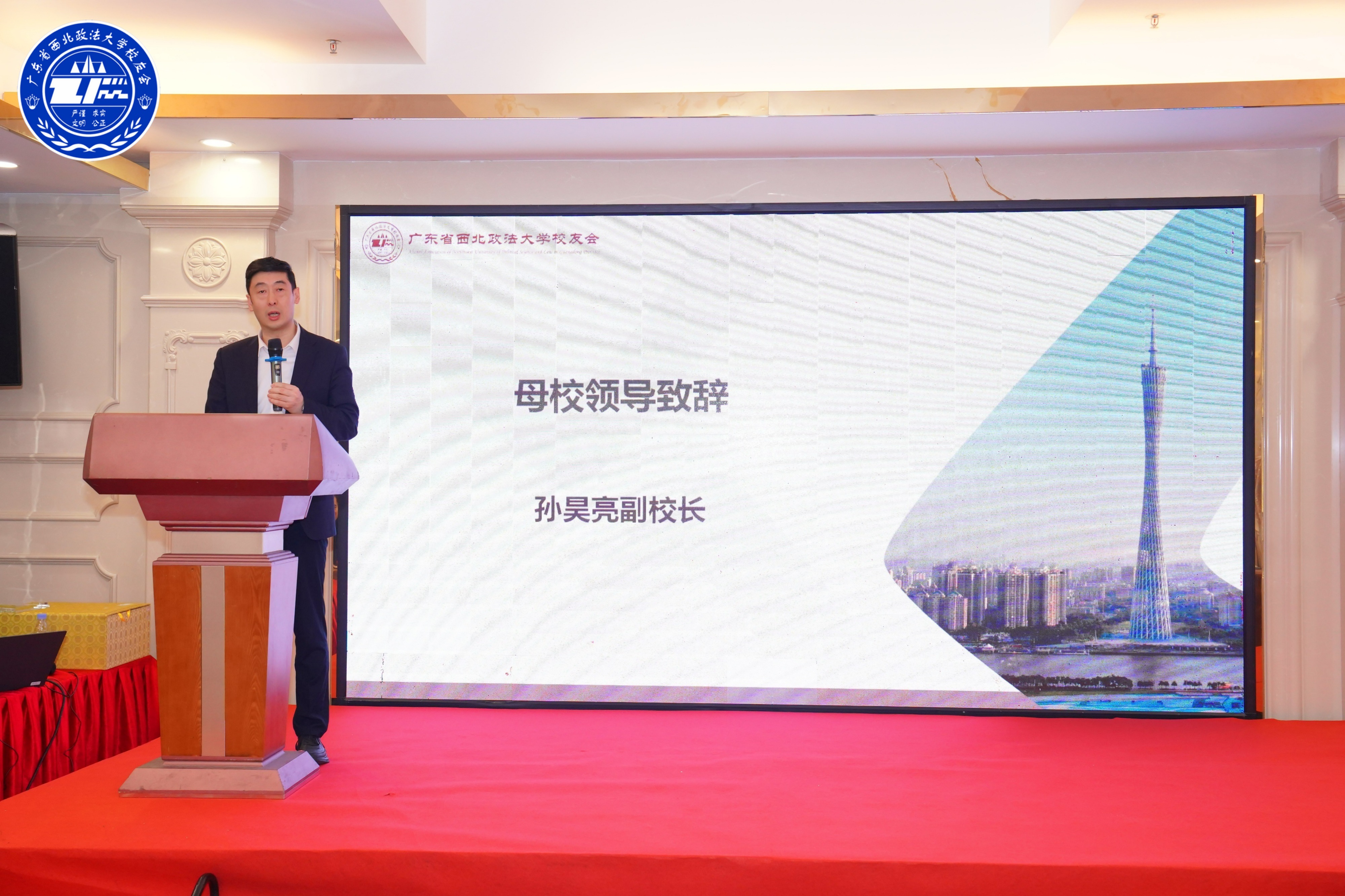 孙昊亮代表学校及校友总会对大会的成功举办表示祝贺。他介绍了学校近年来在学科建设、人才培养、科学研究、师资队伍建设、开放办学等方面取得的进展。对广东以及粤港澳大湾区的校友们始终心系母校,凭借卓越的专业能力、丰硕的社会贡献以及深厚的母校情结,为学校赢得广泛赞誉,并持续助力母校发展的深情厚谊,表达了最诚挚的谢意。他期望校友会继续发挥纽带作用,一如既往地做好校友情谊的“凝聚者”、法治精神的“传承者”、校地发展的“赋能者”,打造资源共享、协同发展的高质量平台,引领西法大校友组织与校友事业不断向前。